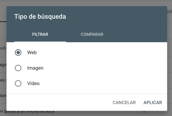 En el filtro de búsqueda web, podemos seleccionar qué tipo de contenidos quería encontrar a la gente cuando escribió en la caja de búsqueda de google las palabras claves que la llevaron a nuestro sitio web.