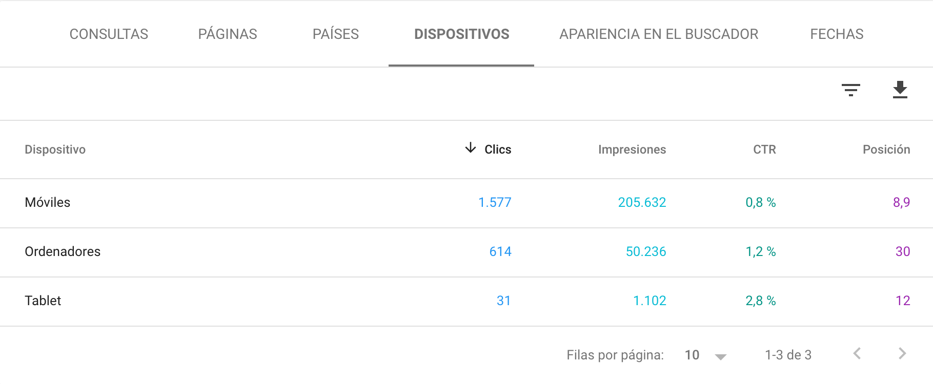 La información tiene dos niveles. La forma en que vemos como, desde donde, que ve y que visita la audiencia en relación con las palabras claves y la del panel. Clics, Impresiones, CTR y Posición Media, para cada una de las vistas del primer nivel que detallo a continuación.