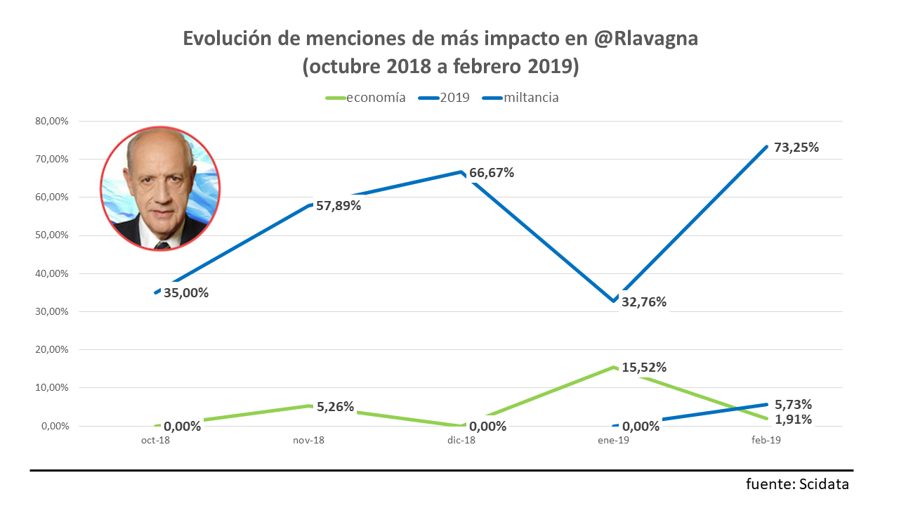 Los datos aportados por Scidata Argentina, nos muestran que, en el caso del economista de extracción peronista, las referencia a su perfil digital @RLavagna vienen prioritariamente desde la militancia y desde su especialidad, la economía.
