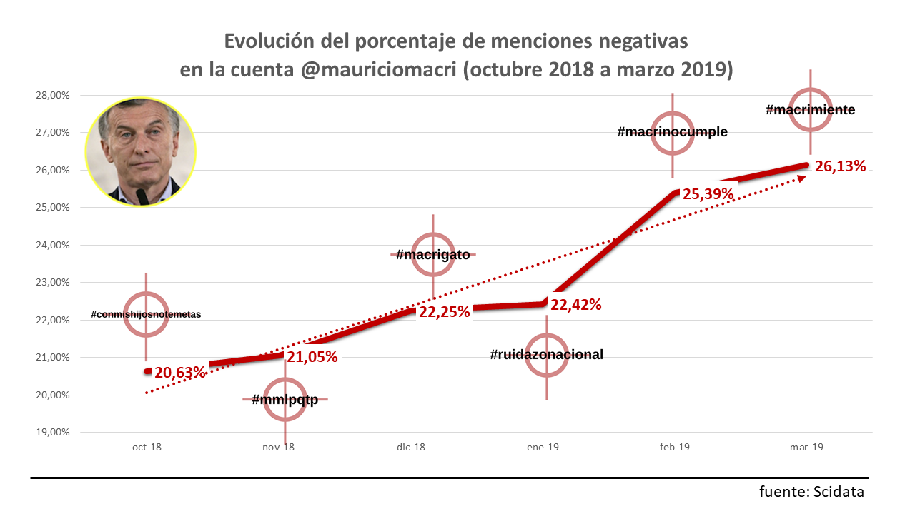 En el caso del presidente Mauricio Macri, el recorrido de críticas y cuestionamientos digitales lo transforman en el candidato con mayor crecimiento de menciones negativas.