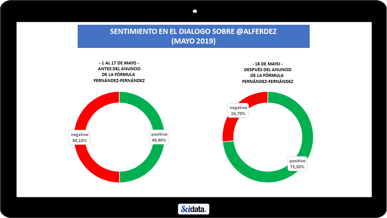 Según Scidata, el diálogo en Twitter, Facebook, Instagram, además de los comentarios en foros y videos, las menciones positivas a @CFKArgentina alcanzaron un total de 2.500 durante el 18 de mayo, 6,1 veces en comparación a las citas de un día anterior.